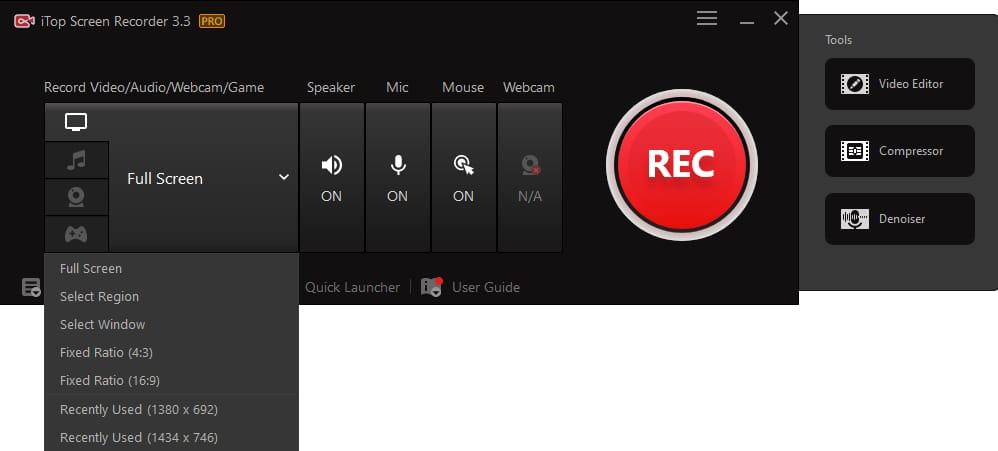 Choose the recording mode by clicking the “Full Screen” drop-down list and selecting whether to record the entire screen or a specific area. You can also enable the speaker, microphone, and webcam as needed.