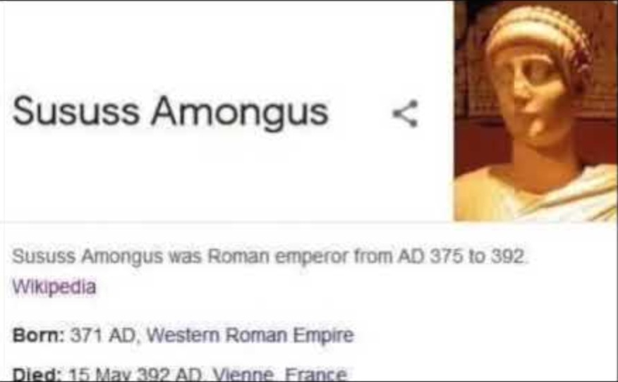 • Sususs Among Us is the name of the Roman Emperor on the meme and the words “Sus” in the game mean suspicious.