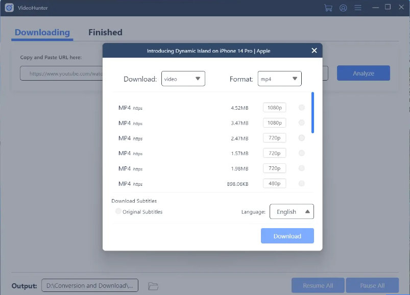 When done analyzing, customize your output option for your video. You may choose the format (MP4/MP3), quality (480p/720p/1080p) or the subtitle language as shown in the picture.