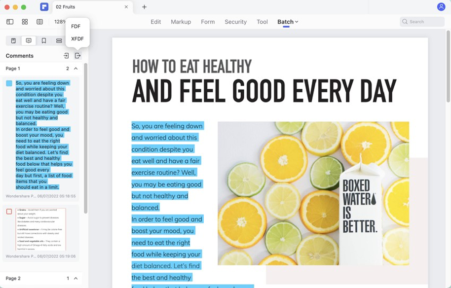 Any document that is used for official purposes can contain different annotations marking the necessary edits and key points related to the content of the PDF file. These comments, notes, annotations, and highlights added across a PDF document can be easily exported across Wondershare PDFelement 9 for Mac. The option of exporting annotations now comes under two different file formats; FDF and XFDF.