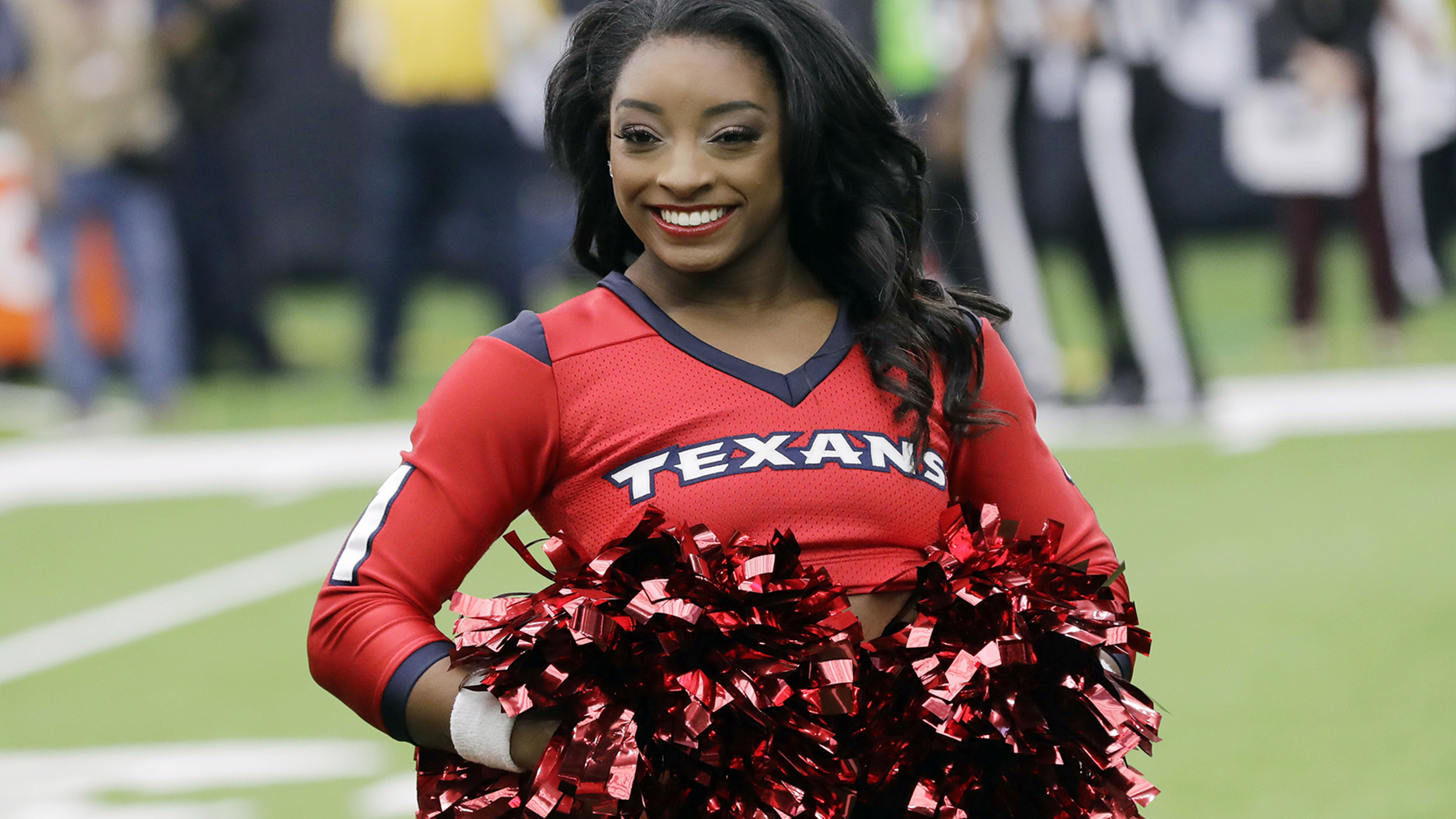 The Houston Texans Cheerleaders requested an honorary cheerleader. Olympian and Texan’s awe-inspiring fan Simone Biles.